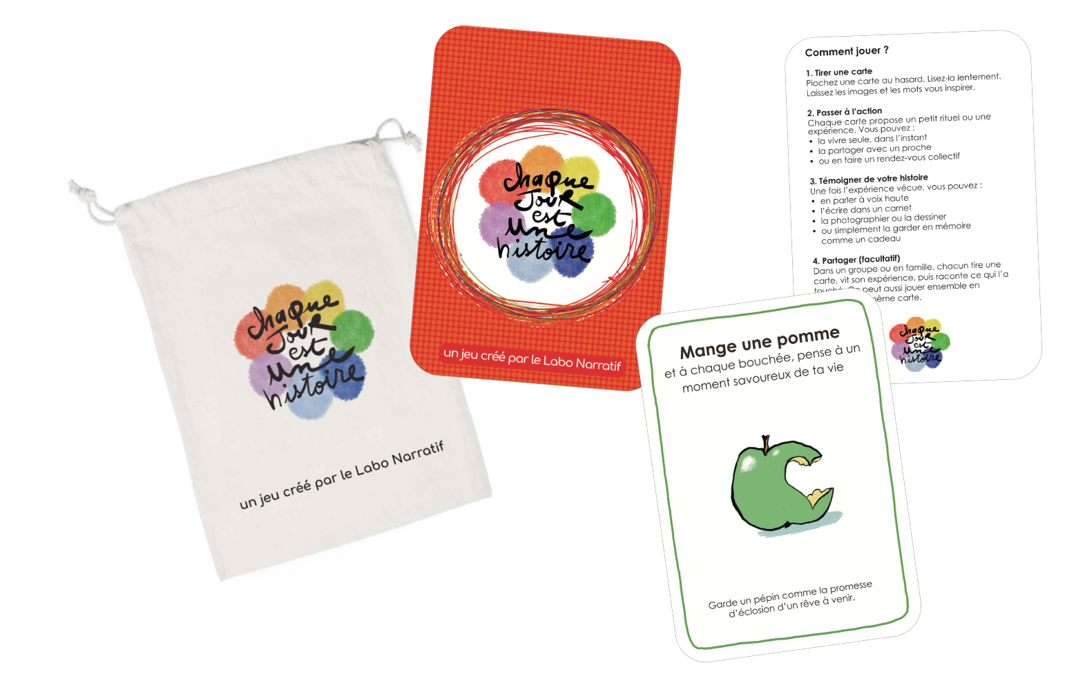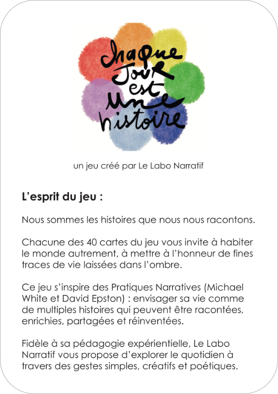 Ce jeu s’inspire des Pratiques Narratives (Michael White et David Epston) : envisager sa vie comme de multiples histoires qui peuvent être racontées, enrichies, partagées et réinventées.